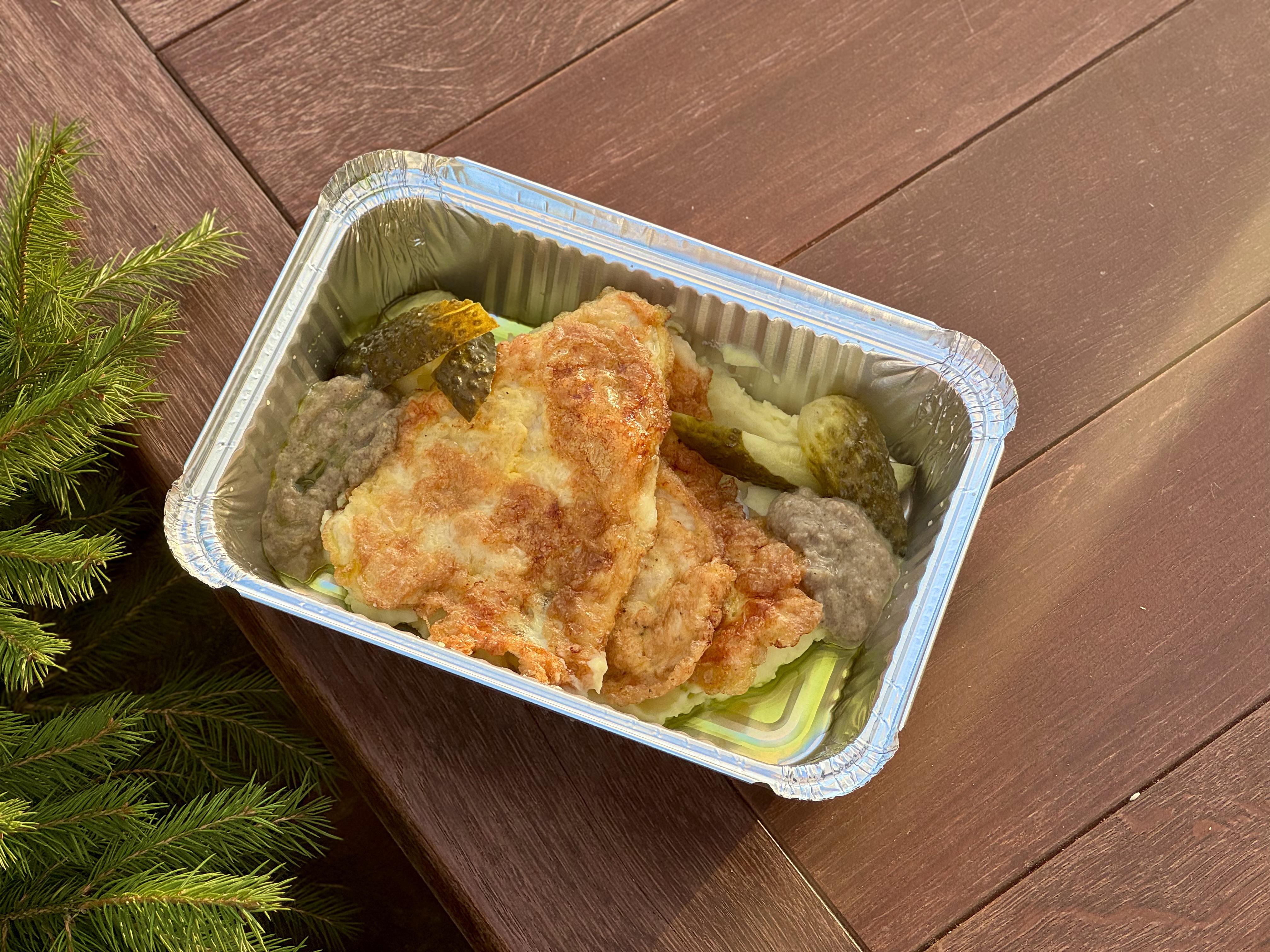 Курячі відбивні з картопляним пюре, грибним соусом та соленими огірочками