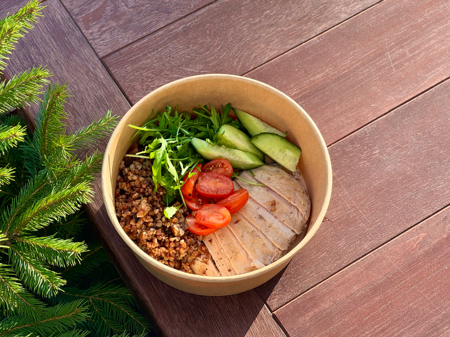Гречка з куркою сувід, білими грибами та свіжими овочами